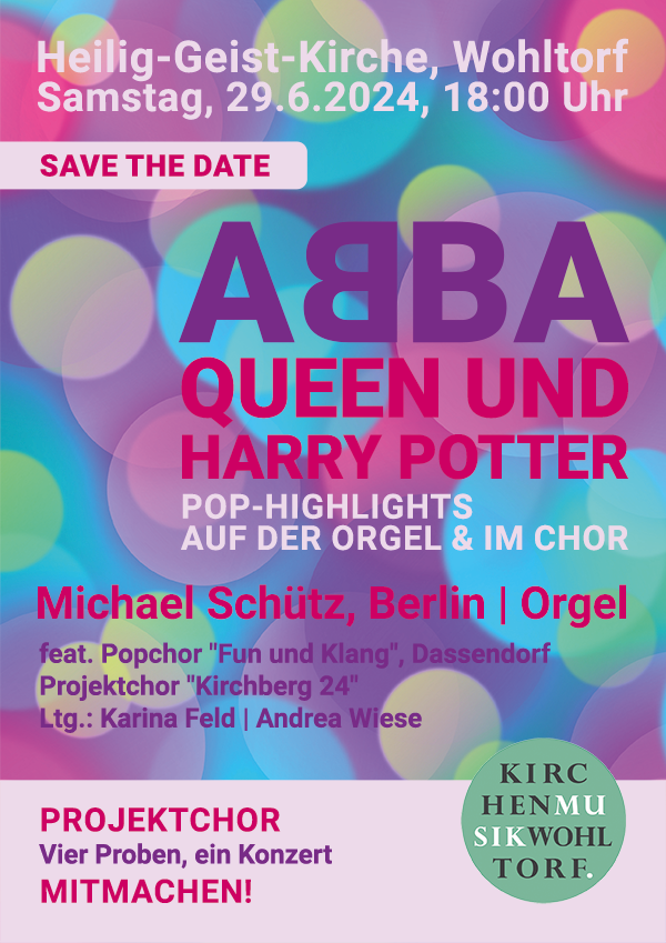 Haben Sie Lust, Pop-Songs von Abba, Queen u.a. zu singen? Heute Abend, Donnerstag, 6.6.2024, startet die erste von vier Proben des Projektchor "Kirchberg 24" in Vorbereitung des Konzertes "ABBA, QUEEN & HARRY POTTER" mit Pop-Organist Michael Schütz, Berlin, Infos hierzu unter der Rubrik "Termine".